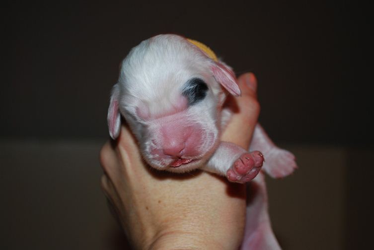 Candy, green collar girl, black markings inside her ears, so she'll be a blue or a tri